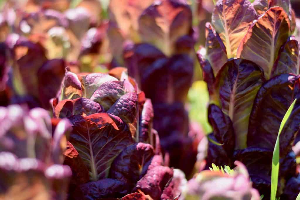 Une variété de légumes à salade présente des teintes allant du violet au bordeaux, créant un beau contraste lorsqu’ils sont plantés à côté de laitues vertes dans le jardin.