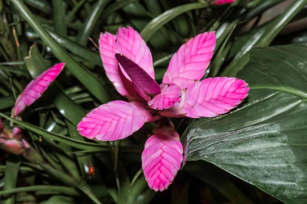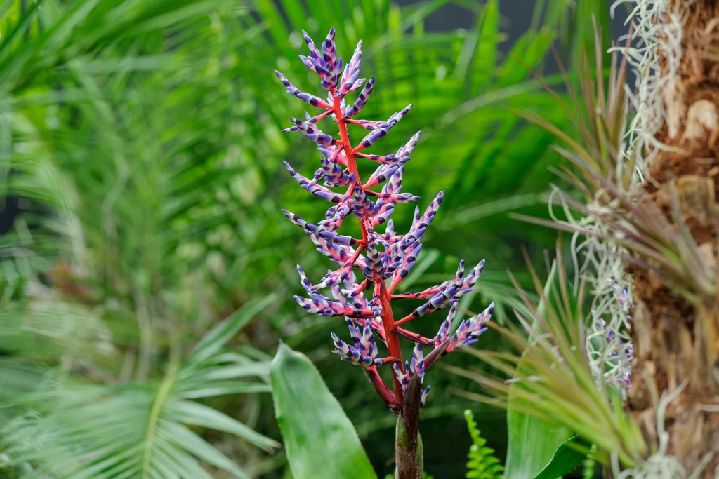 Ce bromélia est originaire de l’Équateur, où il pousse sur les troncs d’arbres. Son pédoncule floral rose est le parfait écrin pour les fleurs bleues, qui sont produites par intermittence.
