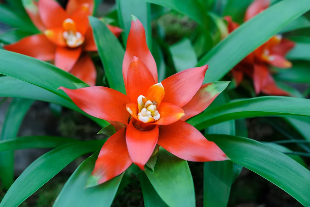 Le Guzmania ‘Tempo’ produit une rosette de feuillage persistant et une inflorescence rouge spectaculaire qui dure environ six semaines.