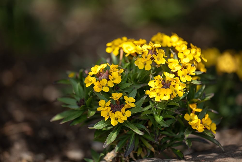 La giroflée Precious Bronze a une croissance en forme de grappe. Les fleurs à quatre pétales sont groupées. Cette fleur est de couleur jaune.