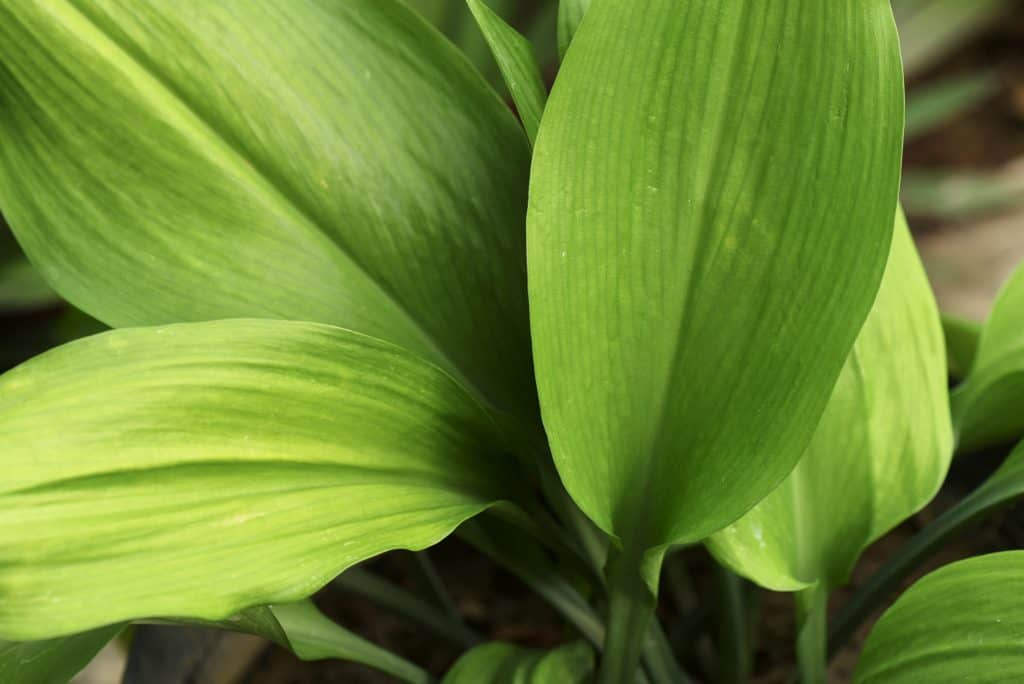 La plante Aspidistra est attrayante et existe en variétés naines (18 pouces) et de grande taille (2′ – 3′ pieds de haut). Les feuilles peuvent être vert foncé, rayées de jaune ou pointillées de jaune.