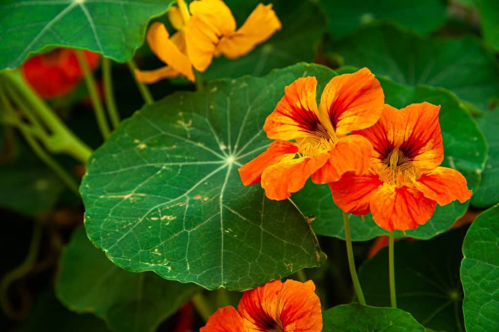 La capucine est une plante grimpante annuelle qui porte de grandes fleurs en forme de trompette de couleur rouge, marron ou jaune.
