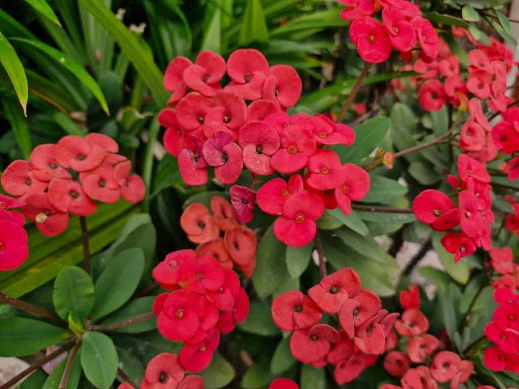 La couronne d’épines (Euphorbia milii) est similaire au kalanchoé et provient des mêmes régions sèches d’Afrique.