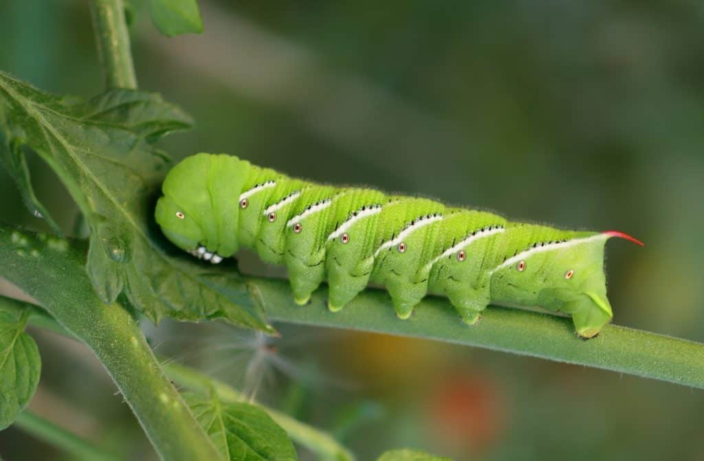 Ravageurs courants de la tomate, ces chenilles gourmandes peuvent rapidement dépouiller le feuillage des plants de tomates, mais aussi des poivrons, des aubergines et des pommes de terre.