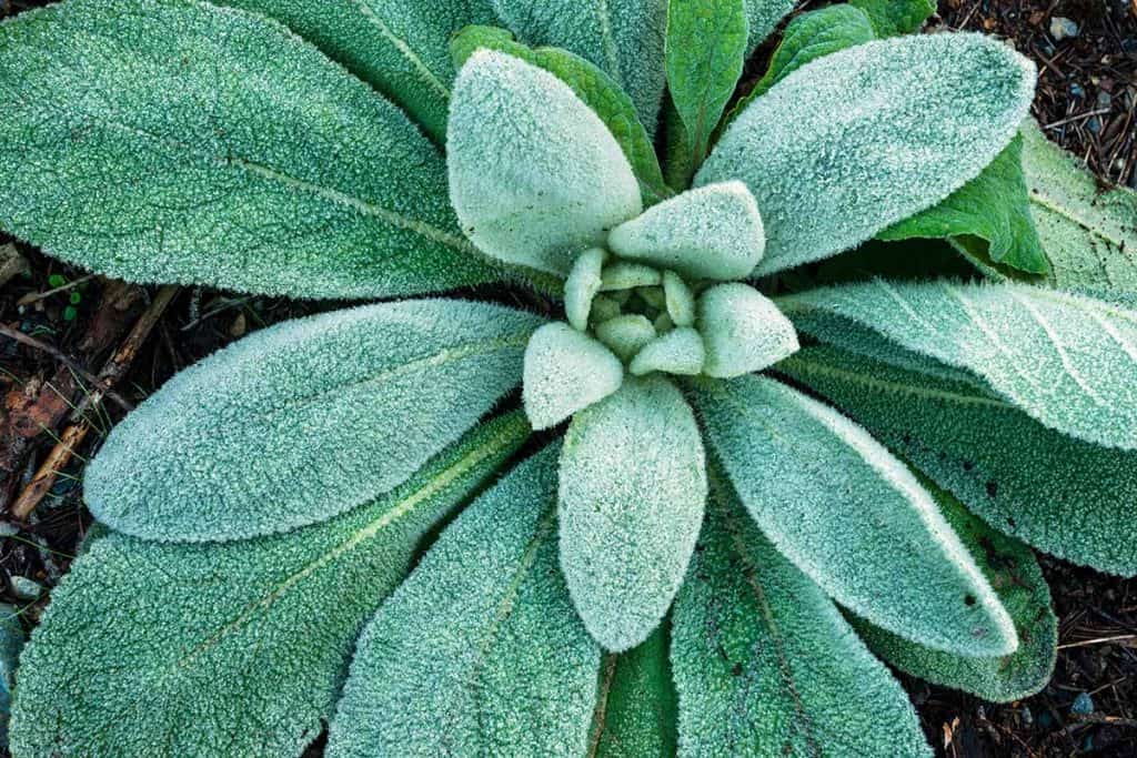 Les grandes feuilles ovales sont couvertes de poils argentés, ce qui donne à cette plante un aspect laineux caractéristique.