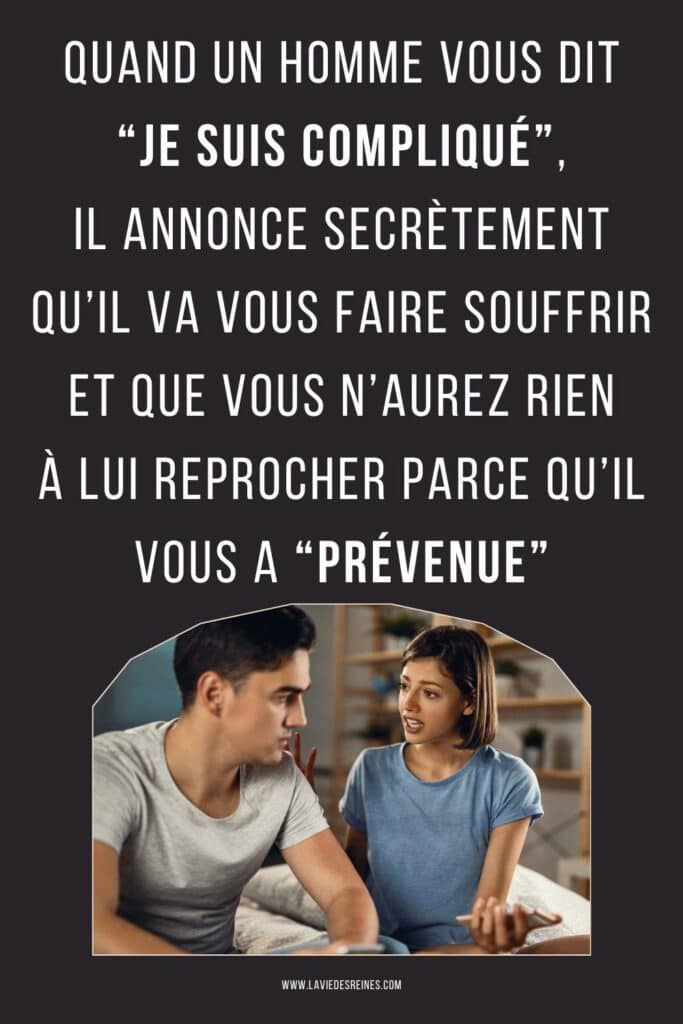 - « Je suis compliqué » signifie : je peux passer de la tendresse à la froideur en une minute sans raison apparente, et ce sera à vous de marcher sur des œufs en espérant retrouver la version aimable de moi-même.